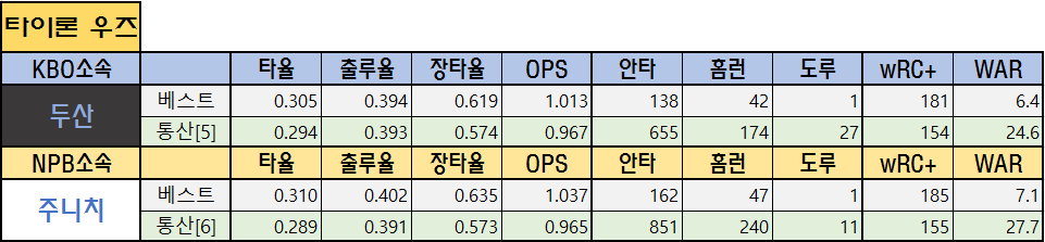| NPB소속 | 타율 | 출루율 | 장타율 | OPS | 안타 | 홈런 | 도루 | wRC+ | WAR | |
