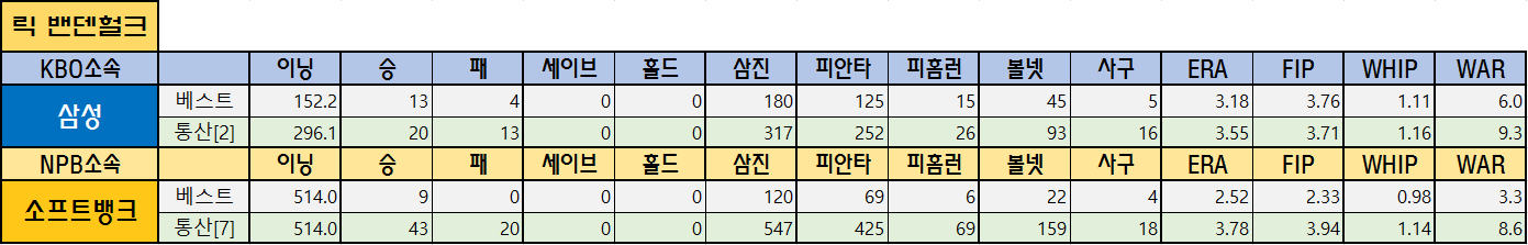 | 소프트뱅크 | 베스트 | 514.0 | 9 | 0 | 0 | 0 | 120 | 69 | 6 | 22 | 4 | 2.52 | 2.33 | 0.98 | 3.3 |