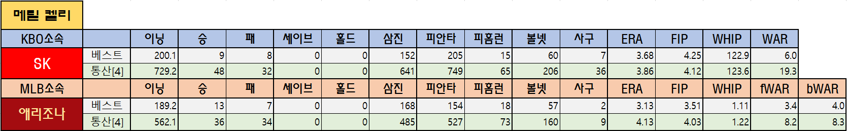 | 애리조나 | 베스트 | 189.2 | 13 | 7 | 0 | 0 | 168 | 154 | 18 | 57 | 2 | 3.13 | 3.51 | 1.11 | 3.4 | 4.0 |