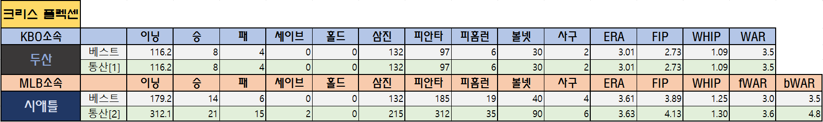 | 시애틀 | 베스트 | 179.2 | 14 | 6 | 0 | 0 | 132 | 185 | 19 | 40 | 4 | 3.61 | 3.89 | 1.25 | 3.0 | 3.5 |
