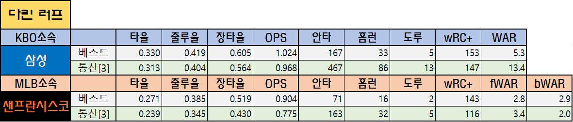 | KBO소속 | 타율 | 출루율 | 장타율 | OPS | 안타 | 홈런 | 도루 | wRC+ | WAR | ||