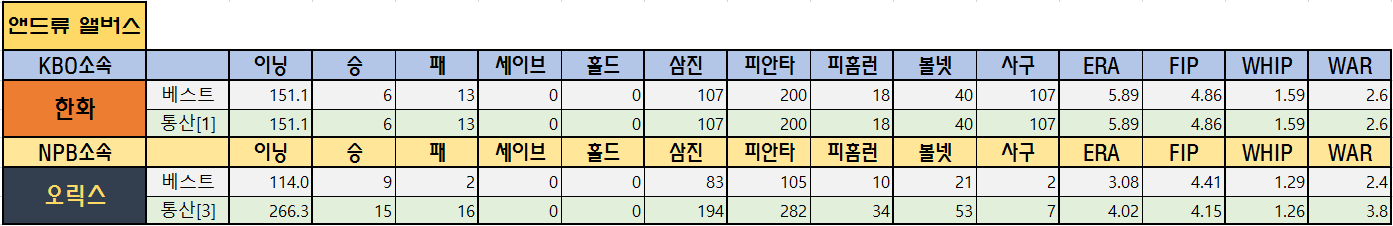 | 한화 | 베스트 | 151.1 | 6 | 13 | 0 | 0 | 107 | 200 | 18 | 40 | 107 | 5.89 | 4.86 | 1.59 | 2.6 |