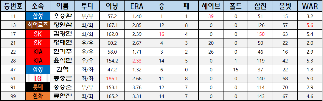 | 17 | SK | 김광현 | 좌/좌 | 162.0 | 2.39 | 16 | 4 | 0 | 0 | 150 | 63 | 5.4 |