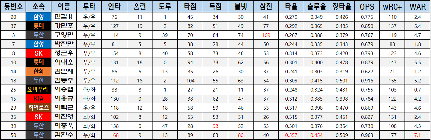 | 50 | 두산 | 김현수 | 우/좌 | 168 | 9 | 13 | 89 | 83 | 80 | 40 | 0.357 | 0.454 | 0.509 | 0.963 | 177 | 7.1 |