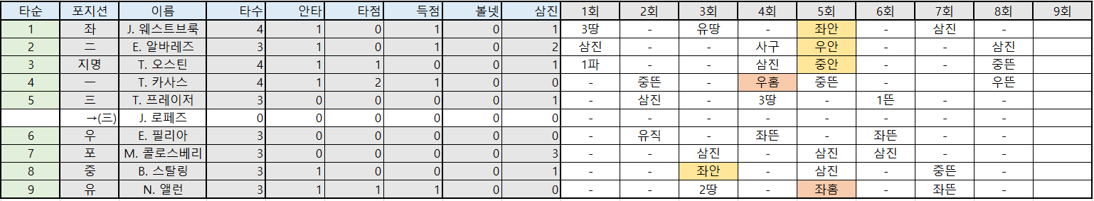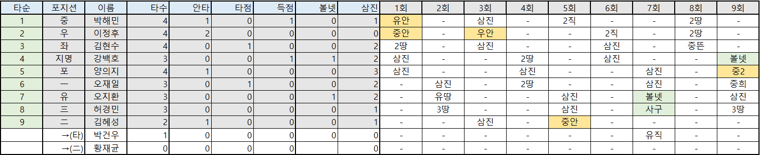 | 타순 | 포지션 | 이름 | 타수 | 안타 | 타점 | 득점 | 볼넷 | 삼진 |