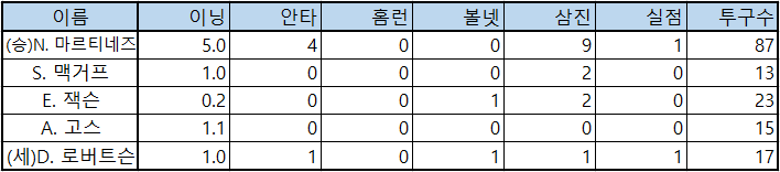 | (승)N. 마르티네즈 | 5.0 | 4 | 0 | 0 | 9 | 1 | 87 |