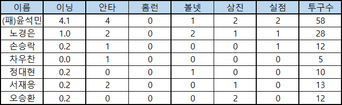 | 정대현 | 0.2 | 0 | 0 | 1 | 0 | 0 | 10 |
