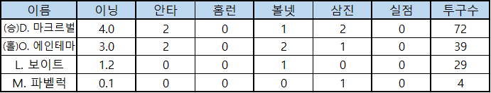 | 이름 | 이닝 | 안타 | 홈런 | 볼넷 | 삼진 | 실점 | 투구수 |