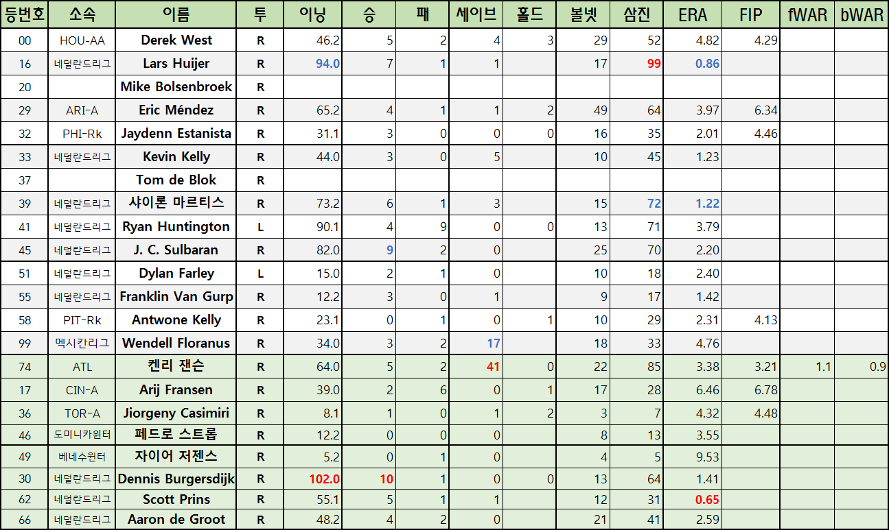 | 55 | 네덜란드리그 | Franklin Van Gurp | R | 12.2 | 3 | 0 | 1 | 9 | 17 | 1.42 | ||||
