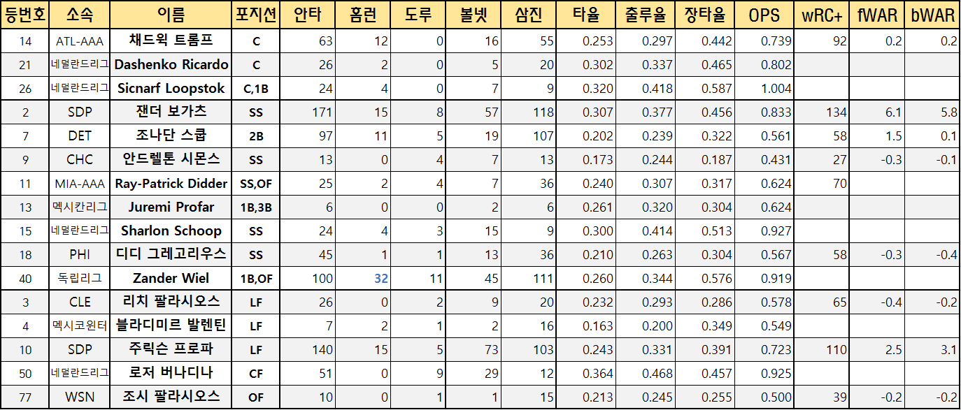 | 등번호 | 소속 | 이름 | 포지션 | 안타 | 홈런 | 도루 | 볼넷 | 삼진 | 타율 | 출루율 | 장타율 | OPS | wRC+ | fWAR | bWAR |
