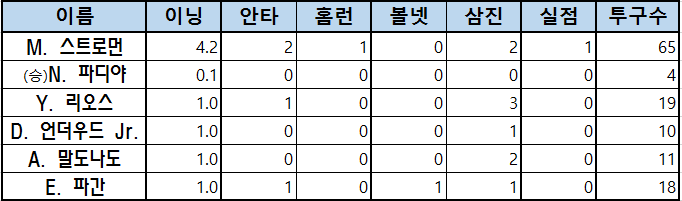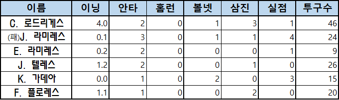 | 이름 | 이닝 | 안타 | 홈런 | 볼넷 | 삼진 | 실점 | 투구수 |