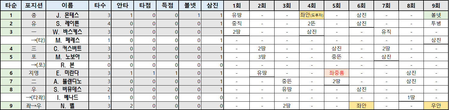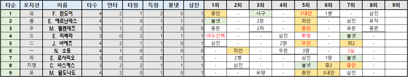 | 타순 | 포지션 | 이름 | 타수 | 안타 | 타점 | 득점 | 볼넷 | 삼진 |